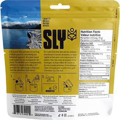 Lait de coco, Lentilles corail, Pois cassés jaunes, Sauce soya, Huile de canola, Oignons, Ail, Cassonade, Épices, Fines herbes.