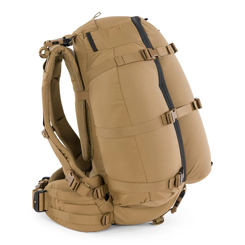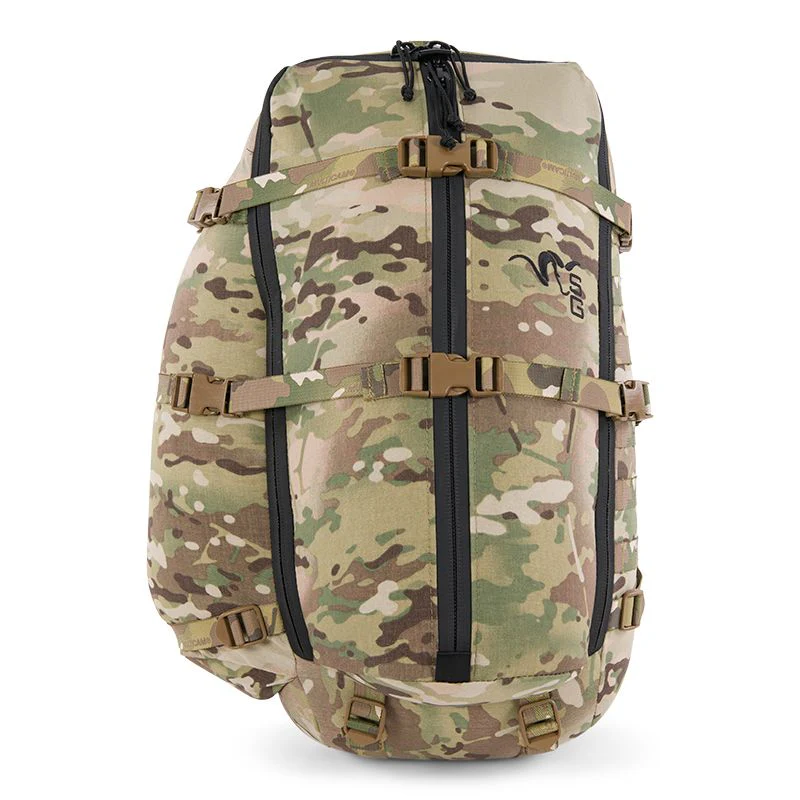 The R2 Series is designed to offer a 36-hour standalone dismounted operations pack. The R2 incorporates male-female connections on all compression straps, load lifters, and shoulder straps. PALS webbing is located on the right external side and on the internal back panel for use with MOLLE accessories and the SG radio harness. An internal spotting scope pocket will accept a straight or angled spotter up to 90mm objective. A comms port on the top adds the ability to route an antenna and comms cables. The R1 is compatible with the SG Hydro Sleeve to carry a 3L (100 oz.) bladder. Shoulder straps can also be removed and attached to the R3 frame to enable efficient carry of 150 lb.+ loads.