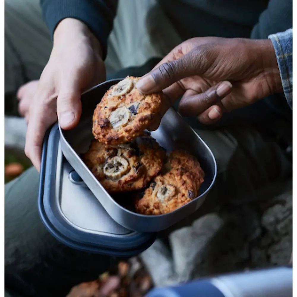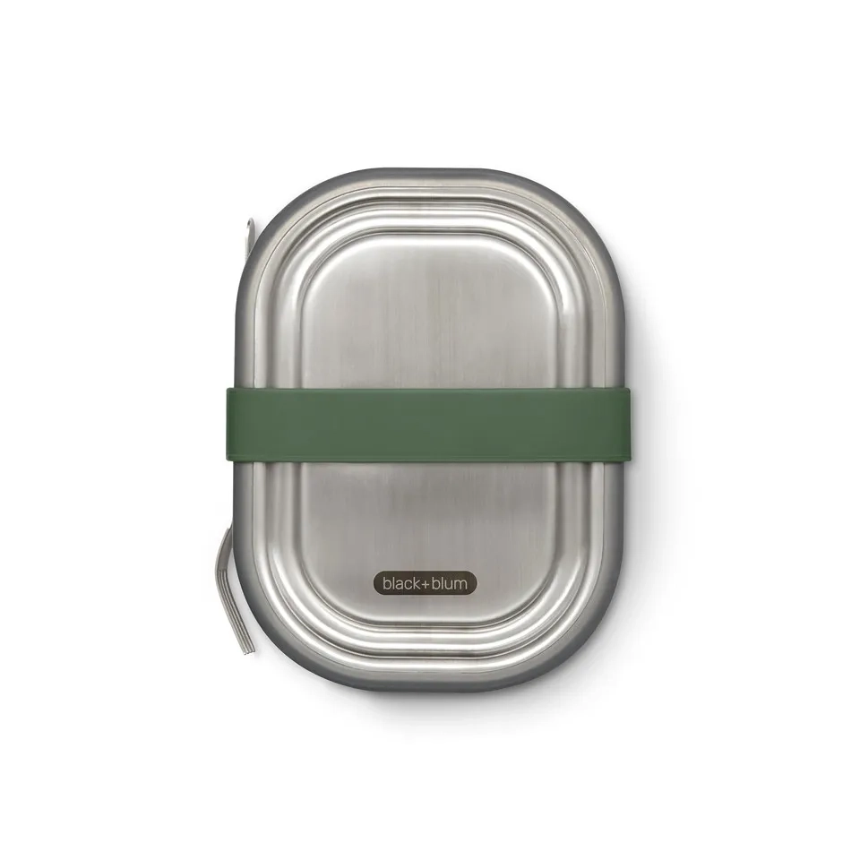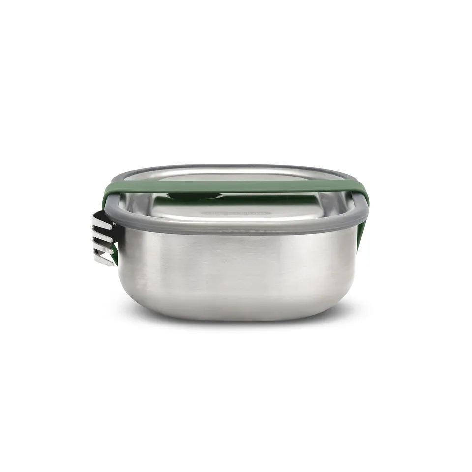 The stainless steel lunchbox lid is specially designed with a silicone overmold to prevent spills and leaks.